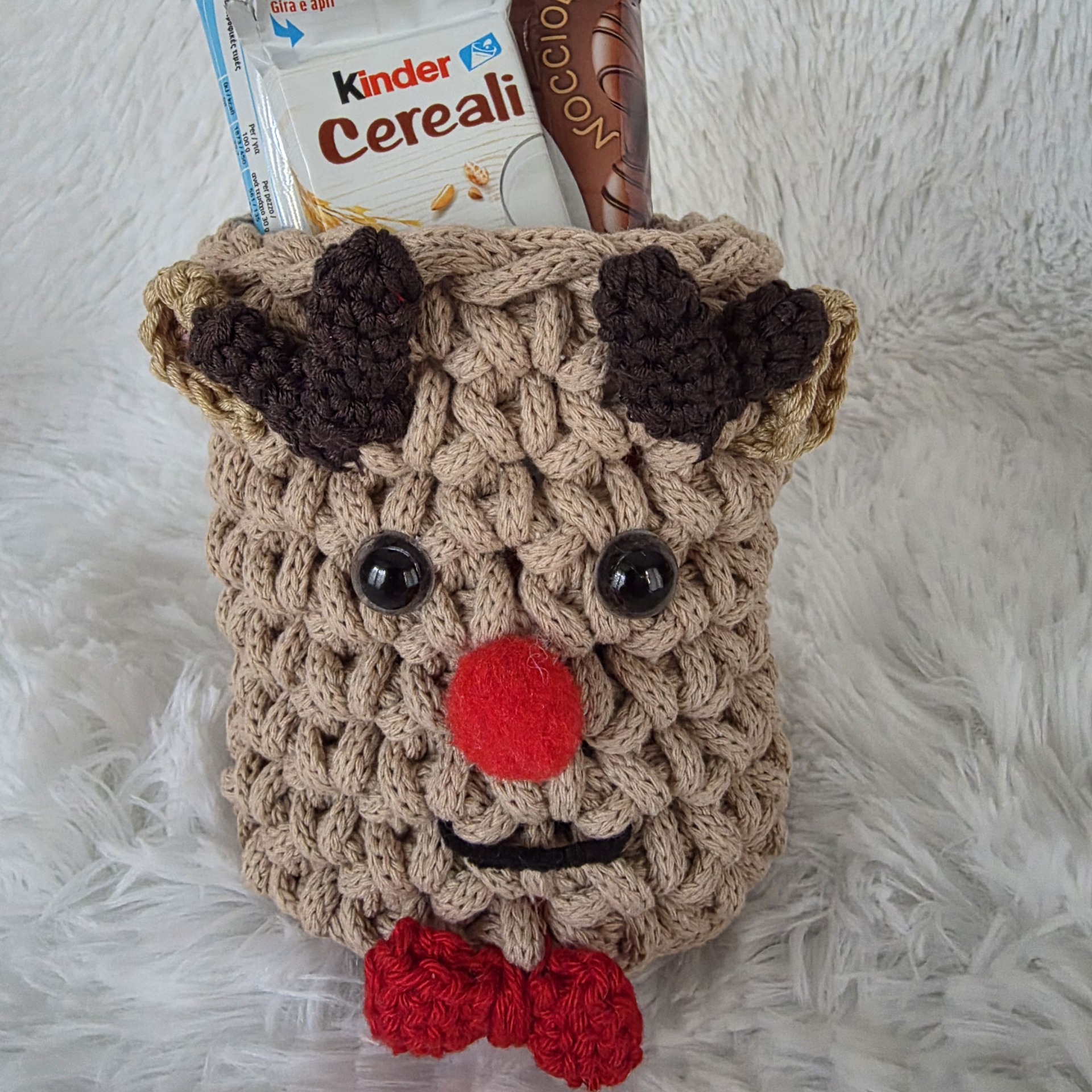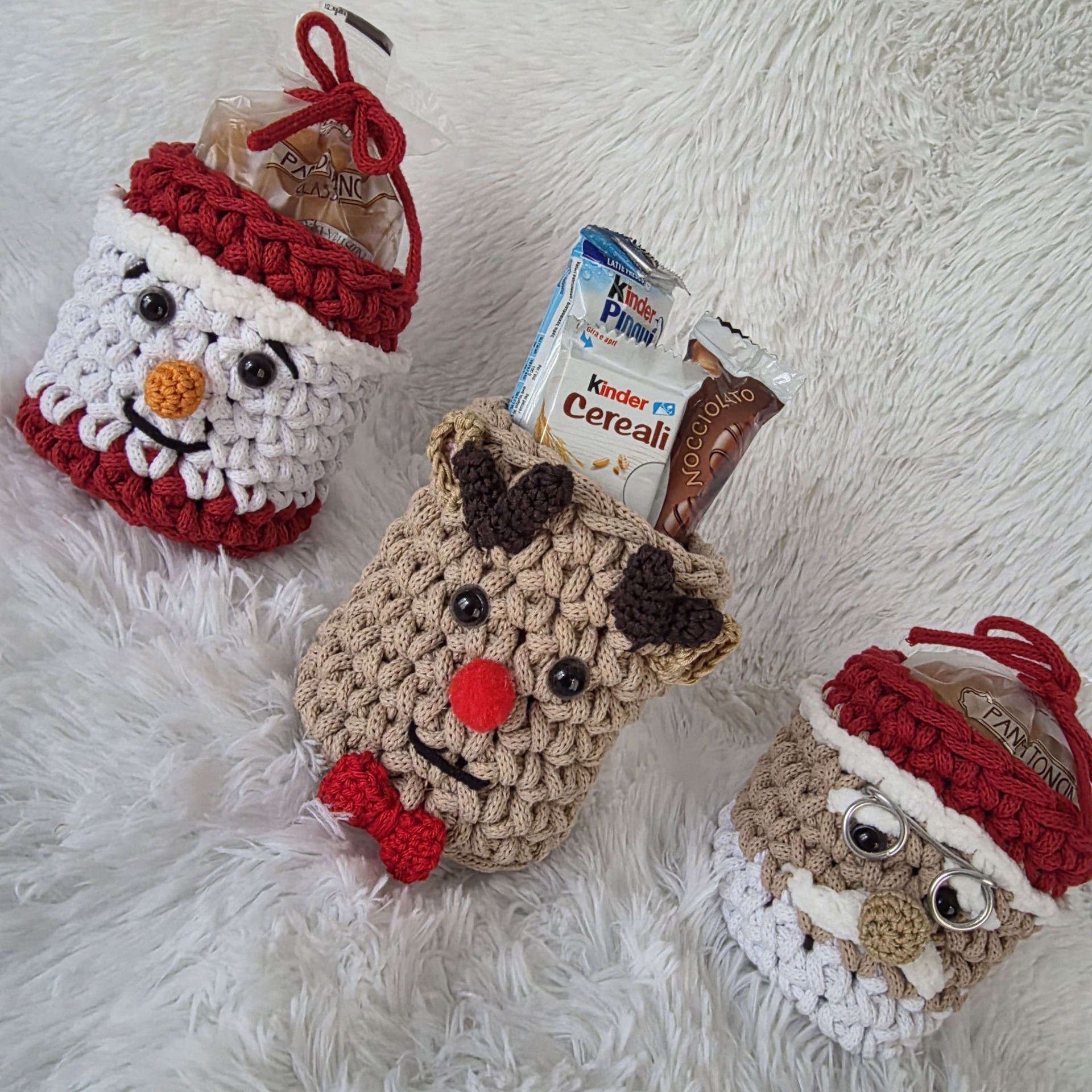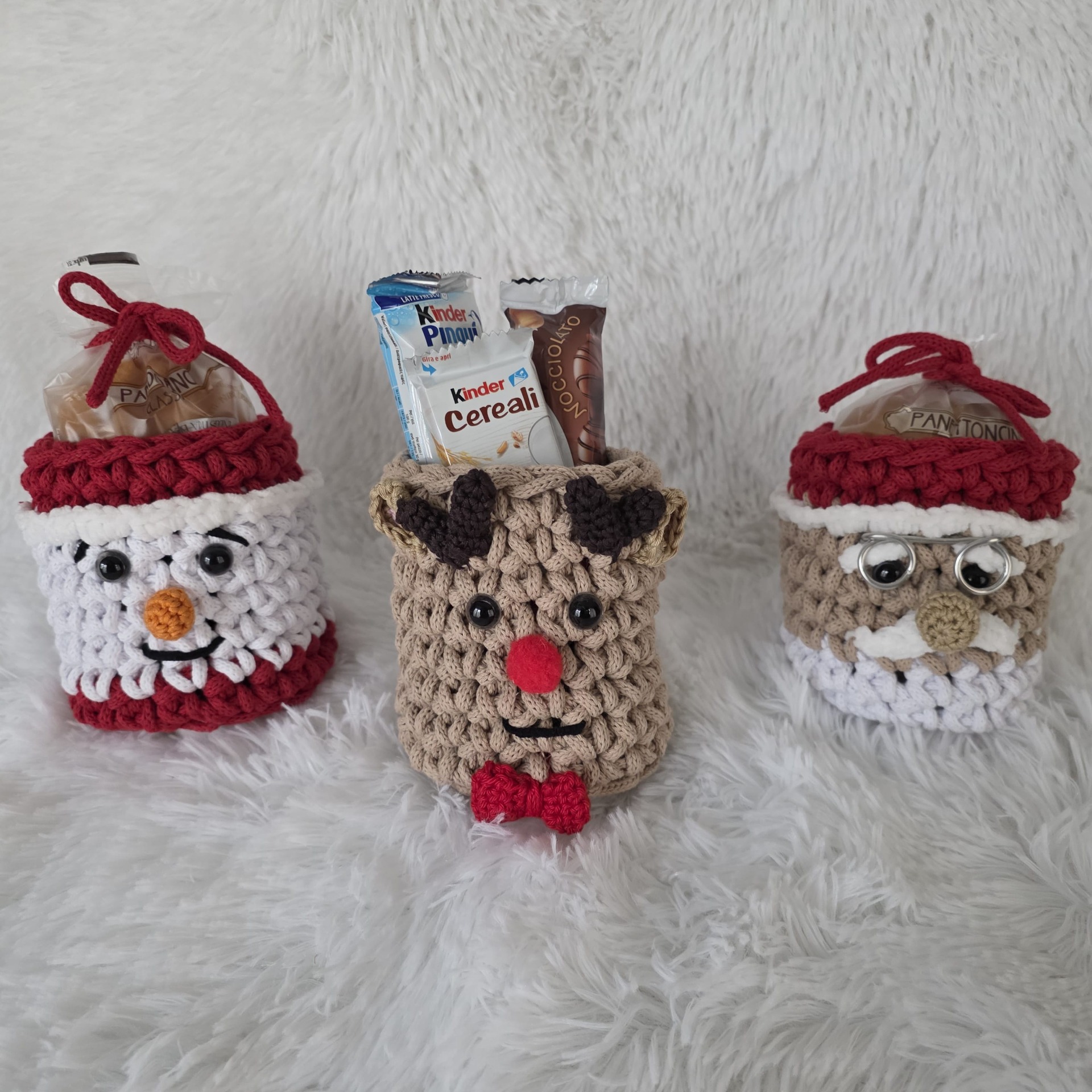 Kit Cestino tema Natale realizzati in cordino di cotone 100% con tre soggetti Babbo Natale - Renna - Pupazzo di neve. Composto da: Cordino Swan cotton - Baby puff - Cotone Cucciolo - Occhietti di sicurezza da 12 mm più schema in regalo.